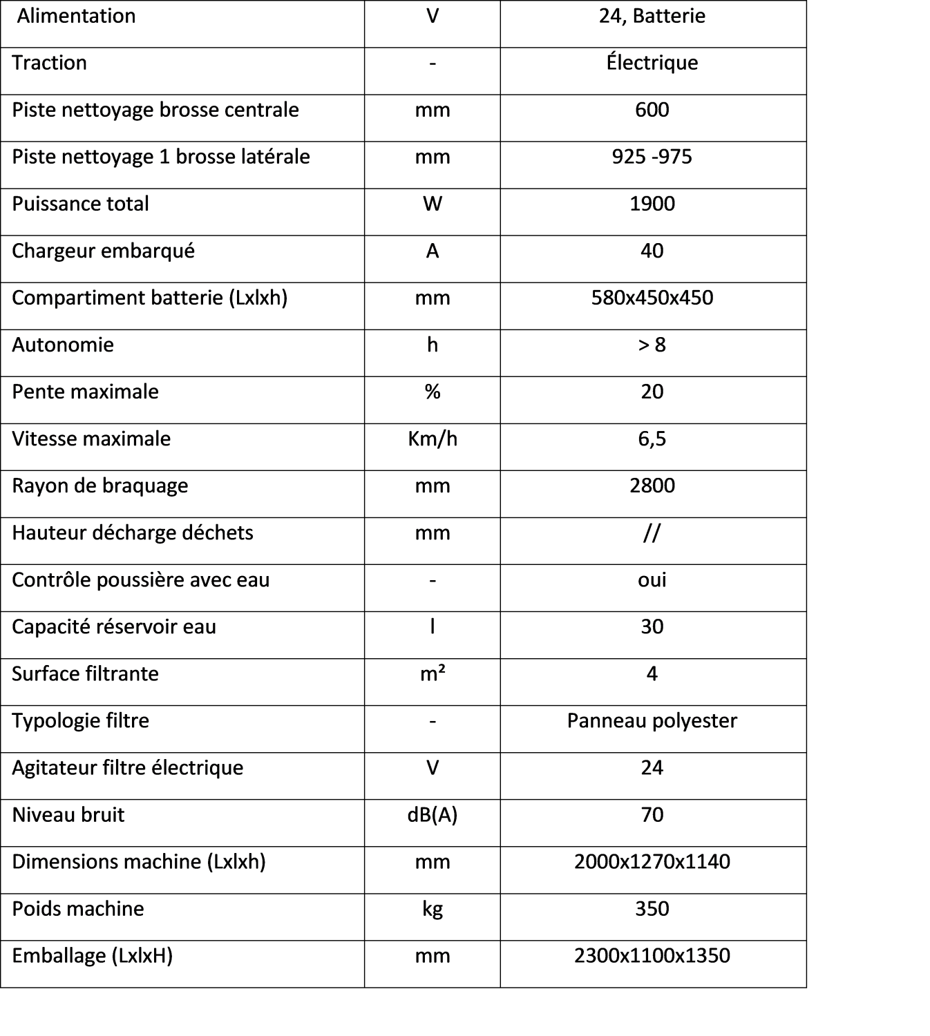 Largeur de balayage : 1250-1350 mm